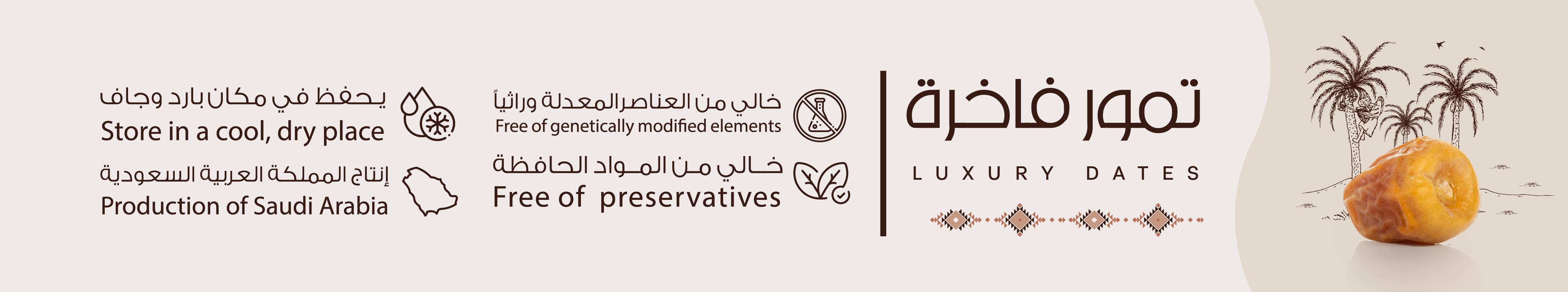 نحرص على تقديم منتجات خالية من المواد الحافظة والعناصر المعدلة وراثيًا، لتعكس التزامنا بتقديم تمور صحية وآمنة، من أرضنا إلى بيوتكم.